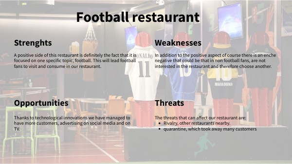 A positive side of this restaurant is definitely the fact that it is focused on one specific topic, football. This will lead football fans to visit and consume in our restaurant.