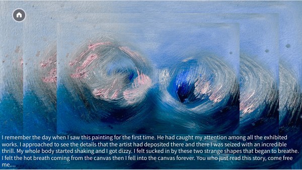 I remember the day when I saw this painting for the first time. He had caught my attention among all the exhibited works. I approached to see the details that the artist had deposited there and there I was seized with an incredible thrill. My whole body started shaking and I got dizzy. I felt sucked in by these two strange shapes that began to breathe. I felt the hot breath coming from the canvas then I fell into the canvas forever. You who just read this story, come free me....