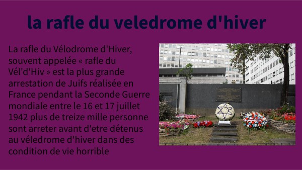 La rafle du Vélodrome d'Hiver, souvent appelée « rafle du Vél'd'Hiv » est la plus grande arrestation de Juifs réalisée en France pendant la Seconde Guerre mondiale entre le 16 et 17 juillet 1942 plus de treize mille personne sont arreter avant d'etre détenus au véledrome d'hiver dans des condition de vie horrible
