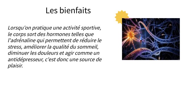 Lorsqu'on pratique une activité sportive, le corps sort des hormones telles que l'adrénaline qui permettent de réduire le stress, améliorer la qualité du sommeil, diminuer les douleurs et agir comme un antidépresseur, c'est donc une source de plaisir.