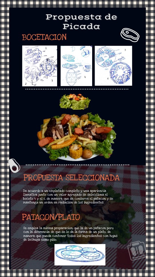 De acuerdo a un emplatado completo y una apariencia llamativa junto con un valor agregado se selecciona el boceto 4 y el 6, de manera que se conserve el patacón y se mantenga un orden en radiación de los ingredientes.