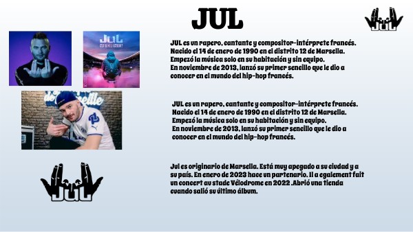 JUL es un rapero, cantante y compositor-intérprete francés.Nacido el 14 de enero de 1990 en el distrito 12 de Marsella. Empezó la música solo en su habitación y sin equipo. En noviembre de 2013, lanzó su primer sencillo que le dio a conocer en el mundo del hip-hop francés.