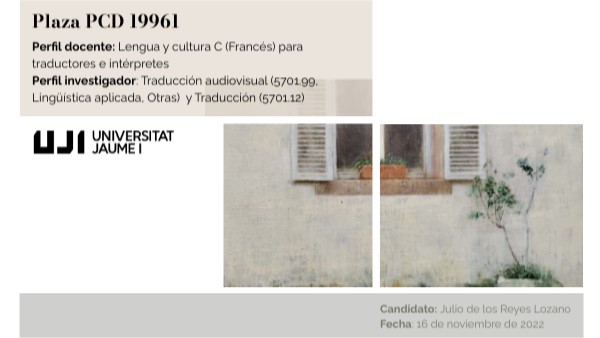 Perfil docente: Lengua y cultura C (Francés) para traductores e intérpretes Perfil investigador: Traducción audiovisual (5701.99, Lingüística aplicada, Otras) y Traducción (5701.12)