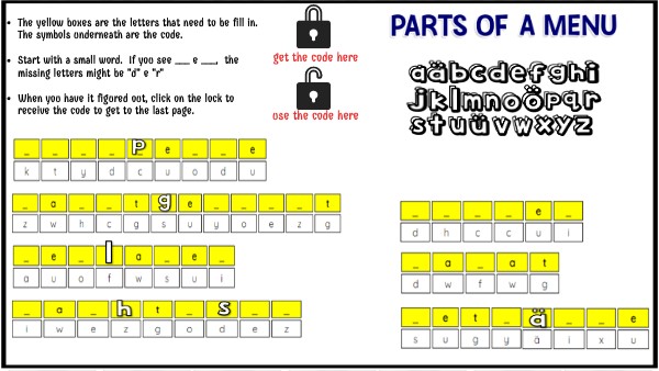 - The yellow boxes are the letters that need to be fill in. The symbols underneath are the code.