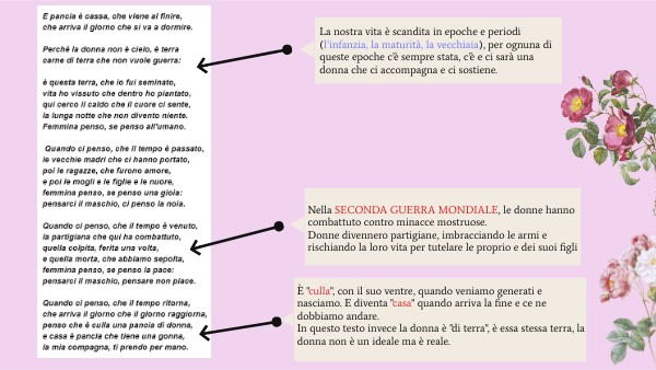 È "culla", con il suo ventre, quando veniamo generati e nasciamo. E diventa "casa" quando arriva la fine e ce ne dobbiamo andare. In questo testo invece la donna è "di terra", è essa stessa terra, la donna non è un ideale ma è reale.