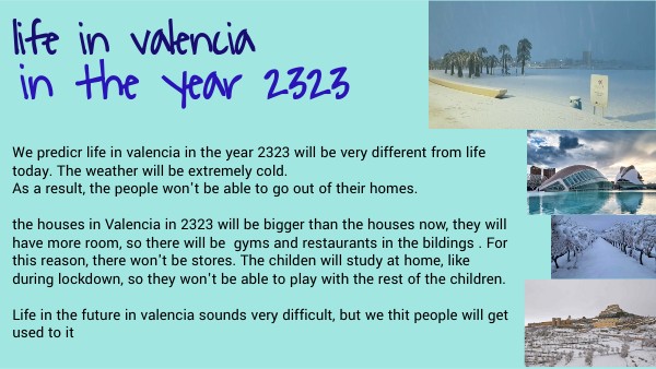 We predicr life in valencia in the year 2323 will be very different from life today. The weather will be extremely cold.As a result, the people won't be able to go out of their homes. the houses in Valencia in 2323 will be bigger than the houses now, they will have more room, so there will be gyms and restaurants in the bildings . For this reason, there won't be stores. The childen will study at home, like during lockdown, so they won't be able to play with the rest of the children. Life in the future in valencia sounds very difficult, but we thit people will get used to it