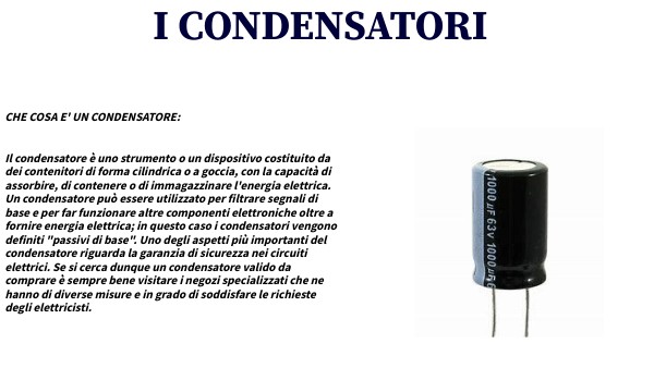CHE COSA E' UN CONDENSATORE: Il condensatore è uno strumento o un dispositivo costituito da dei contenitori di forma cilindrica o a goccia, con la capacità di assorbire, di contenere o di immagazzinare l'energia elettrica. Un condensatore può essere utilizzato per filtrare segnali di base e per far funzionare altre componenti elettroniche oltre a fornire energia elettrica; in questo caso i condensatori vengono definiti "passivi di base". Uno degli aspetti più importanti del condensatore riguarda la garanzia di sicurezza nei circuiti elettrici. Se si cerca dunque un condensatore valido da comprare è sempre bene visitare i negozi specializzati che ne hanno di diverse misure e in grado di soddisfare le richieste degli elettricisti.