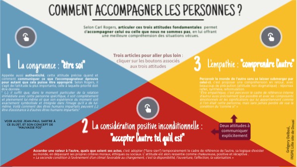 Selon Carl Rogers, articuler ces trois attitudes fondamentales permet d'accompagner celui ou celle que nous ne sommes pas, en lui offrant une meilleure compréhension des situations vécues.