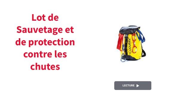 Une corde semi-statique de 30 m minimum pour le lot de sauvetage, 60 m pour le lot échelle minimum, ø 12 à 13 mm, charge à la rupture >3000kg, allongement inférieur ou égal à 4%.