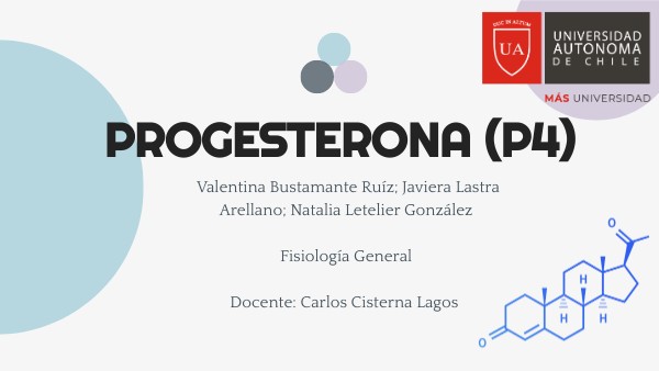El tema a tratar son las generalidades de la progesterona, el objetivo de esta presentación es dar a conocer la progesterona como hormona endocrina funcional dentro del cuerpo humano (tanto en hombres como mujeres)