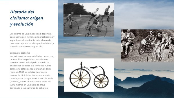 El ciclismo es una modalidad deportiva, que cuenta con millones de practicantes y seguidores alrededor de todo el mundo, pero este deporte no siempre ha sido tal y como lo conocemos hoy en día. Origen del ciclismo Las primeras carreras ciclistas nacen muy pronto. Aún sin pedales, se celebran carreras con el velocípedo. Cuando se añaden los pedales a la inmensa rueda delantera, éstas se regularizan. El 31 de mayo de 1868 se celebra la primera carrera de bicicletas documentada del mundo, en el parque Saint Claud de París (Francia), sobre una distancia corta de 1.200 metros en un suelo de grava destinado a las carreras de caballos.