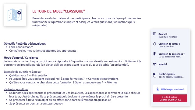 Mode d'emploi / ConsignesLe formateur invite chaque participants à répondre à 3 questions à tour de rôle en désignant explicitement la personne qui prend la parole (en distanciel) ou en précisant le sens du tour de table (en présentiel). Exemple de questions à poser