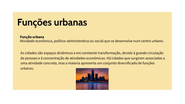 As cidades são espaços dinâmicos e em constante transformação, devido à grande circulação de pessoas e à concentração de atividades económicas. Há cidades que surgiram associadas a uma atividade concreta, mas a maioria apresenta um conjunto diversificado de funções urbanas.