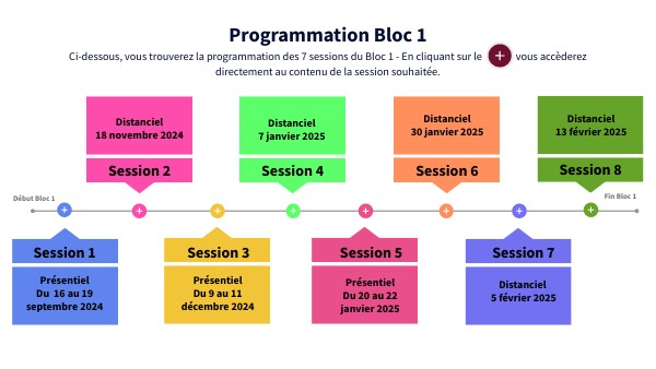 Ci-dessous, vous trouverez la programmation des 7 sessions du Bloc 1 - En cliquant sur le vous accèderez directement au contenu de la session souhaitée.