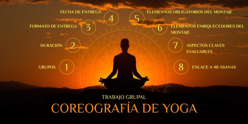 0. MÚSICA. Música acorde al yoga (calmada, relajante, sin letra, lenta, etc.). 1. DEDICATORIA DE LA PRÁCTICA. Dedicad la práctica a lo que queráis. Podéis dedicar la práctica a: - A vosotros mismos, a vuestra motivación que os ha dado la fuerza y voluntad para crear esta coreografía - A lo bueno que tenéis, vuestras cualidades - A vuestra felicidad, a vuestra paz interior - Al respeto hacia vuestro cuerpo, hacia todos los seres que os rodean 2. INICIO Y FINAL COREOGRÁFICO. El montaje debe tener un inicio y un final diferenciado, marcado. 3. SECUENCIA DE 15 ASANAS MÍNIMO. Que la secuencia de asanas tenga una evolución coherente. 4. EN CADA ASANA HAY QUE ESTAR AL MENOS DURANTE 2 RESPIRACIONES. 5. INTRODUCIR AL MENOS 3 TRANSICIONES DE MOVIMIENTOS ENTRE ASANAS. Que no sólo sea enlazar asanas una tras otra, sino que haya al menos tres momentos en los que realizáis otros movimientos creativos. 6. FINALIZAR CON "NAMASTÉ". Señal de despedida y de respeto hacia la práctica de yoga. Se realiza juntando las manos en modo de rezo, en el centro del pecho, en el corazón o en la frente, a la vez que se inclina la cabeza en actitud de humildad frente a otros.