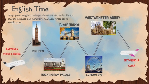 Compi questo viaggio a Londra per ripassare tutto ciò che abbiamo studiato in inglese. Ogni monumento ha una soprpresa per te. Premici sopra.