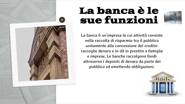 La banca è un'impresa la cui attività consiste nella raccolta di risparmio tra il pubblico unitamente alla concessione del credito: raccoglie denaro e lo dà in prestito a famiglie e imprese. Le banche raccolgono fondi attraverso i depositi di denaro da parte del pubblico ed emettendo obbligazioni.