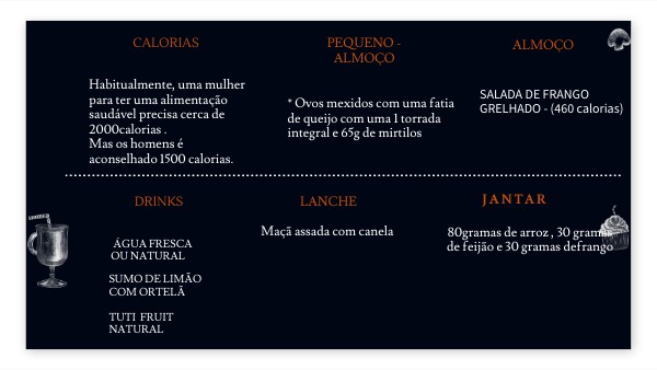 Habitualmente, uma mulher para ter uma alimentação saudável precisa cerca de 2000calorias . Mas os homens é aconselhado 1500 calorias.