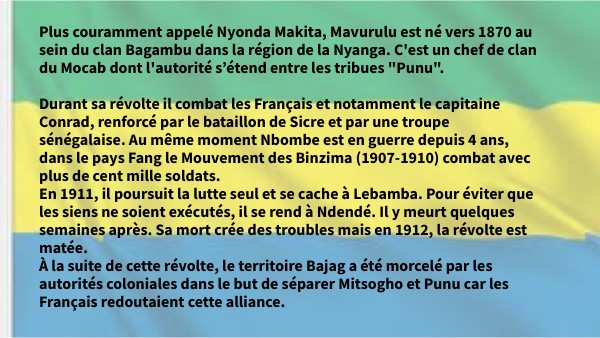 Plus couramment appelé Nyonda Makita, Mavurulu est né vers 1870 au sein du clan Bagambu dans la région de la Nyanga. C'est un chef de clan du Mocab dont l'autorité s’étend entre les tribues "Punu". Durant sa révolte il combat les Français et notamment le capitaine Conrad, renforcé par le bataillon de Sicre et par une troupe sénégalaise. Au même moment Nbombe est en guerre depuis 4 ans, dans le pays Fang le Mouvement des Binzima (1907-1910) combat avec plus de cent mille soldats. En 1911, il poursuit la lutte seul et se cache à Lebamba. Pour éviter que les siens ne soient exécutés, il se rend à Ndendé. Il y meurt quelques semaines après. Sa mort crée des troubles mais en 1912, la révolte est matée. À la suite de cette révolte, le territoire Bajag a été morcelé par les autorités coloniales dans le but de séparer Mitsogho et Punu car les Français redoutaient cette alliance.