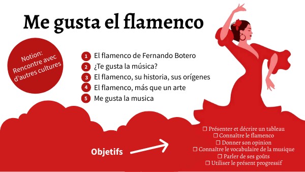 Para mí, el flamenco es un tipo de música y un baile. Creo que solo las mujeres bailan flamenco con un vestido rojo con lunares negros. Me parece que es similar al claqué. Pienso que el flamenco es difícil. El flamenco es un arte andaluz que integra el baile, el cante y la música. Hoy en día, el flamenco es internacional. El flamenco es patrimonio cultural inmaterial de la humanidad en la UNESCO desde 2010.