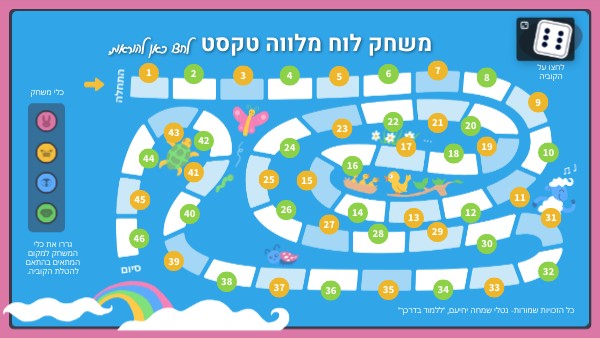 לפניכם משחק לוח מלווה טקסט. הניחו את הטקסט לפניכם והטילו את הקוביה. לאחר מכן, התקדמו לפי תוצאת ההטלה ולחצו על המספר שאליו הגעתם. ענו על השאלה.אם אינכם יודעים לענות, המתינו תור לפני שתמשיכו לשחק.