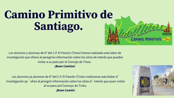 Los alumnos y alumnas de 6º del C.P. El Pascón (Tineo) hemos realizado esta labor de investigación que ofrece al peregrino información sobre los sitios de interés que pueden visitar a su paso por el Concejo de Tineo. ¡Buen Camino!
