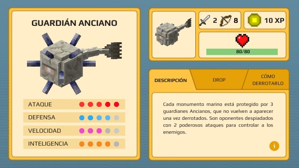 El láser es su ataque más letal. Ponte a cubierto si ves que lo está cargando. Este mob es susceptible al Encantamiento Empalador, que aumenta el poder de ataque a tu tridente. Lánzale un tridente al guardián Anciano y ponte a cubierto.