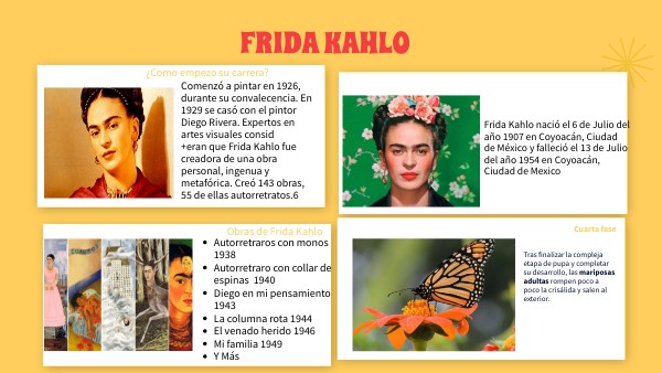 Comenzó a pintar en 1926, durante su convalecencia. En 1929 se casó con el pintor Diego Rivera. Expertos en artes visuales consid+eran que Frida Kahlo fue creadora de una obra personal, ingenua y metafórica. Creó 143 obras, 55 de ellas autorretratos.6