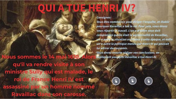Consignes: Vous êtes nommé(e)s pour diriger l'enquête, et établir pourquoi Ravaillac a tué le roi. Pour cela, vous devez vous répartir le travail. L'un-e d'entre vous doit comprendre quelle était la personnalité de Ravaillac, un-e autre la situation en France à cette époque, et enfin un-e autre la politique menée par Henri IV qui pouvait lui attirer des ennemis. Vous devez ensuite rédiger vos conclusions, en expliquant pourquoi Ravaillac a tué Henri IV.