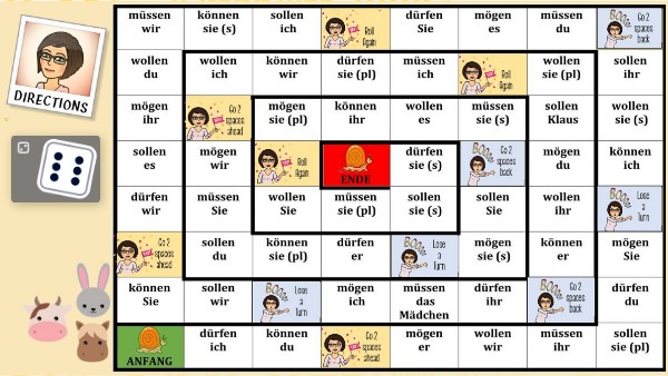 *Players take turns *Roll the die and move forward *Say the modal conjugation in German *Check answer by clicking on the square *Remain on square if correct *Go back the number rolled if incorrect *First player to the center of the snail wins