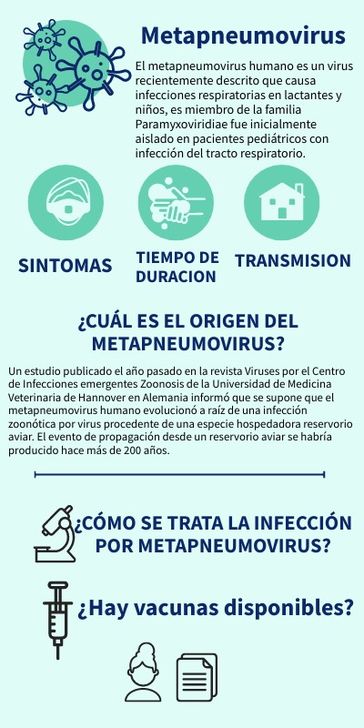 El metapneumovirus humano es un virus recientemente descrito que causa infecciones respiratorias en lactantes y niños, es miembro de la familia Paramyxoviridiae fue inicialmente aislado en pacientes pediátricos con infección del tracto respiratorio.