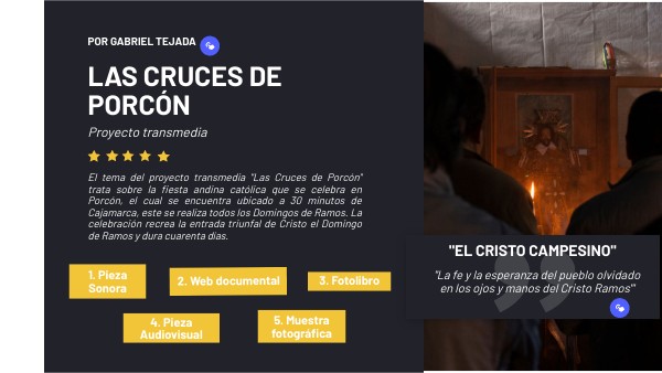 El tema del proyecto transmedia "Las Cruces de Porcón" trata sobre la fiesta andina católica que se celebra en Porcón, el cual se encuentra ubicado a 30 minutos de Cajamarca, este se realiza todos los Domingos de Ramos. La celebración recrea la entrada triunfal de Cristo el Domingo de Ramos y dura cuarenta días.