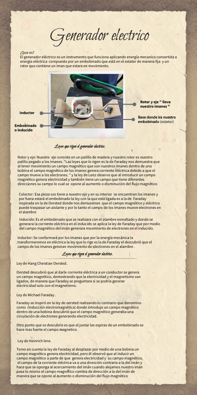 ¿Que es? El generador eléctrico es un instrumento que funciona aplicando energía mecanica convertida a energía eléctrica compuesto por un embobinado que está en el estator de manera fija y un rotor que contiene un iman que estara en movimiento.