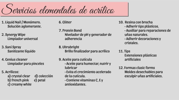 1. Liquid Nail / Monómero. Solución aglomerante.2. Synergy Wipe Limpiador universal 3. Sani Spray Sanitizante líquido 4. Genius cleaner Limpiador para pinceles 5. Acrílicos: a) crystal clear d) colección b) french pink e) petal c) creamy white