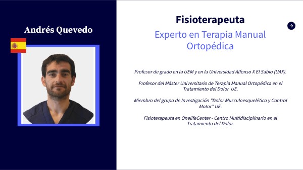 Profesor de grado en la UEM y en la Universidad Alfonso X El Sabio (UAX). Profesor del Máster Universitario de Terapia Manual Ortopédica en el Tratamiento del Dolor UE. Miembro del grupo de Investigación "Dolor Musculoesquelético y Control Motor" UE. Fisioterapeuta en OnelifeCenter - Centro Multidisciplinario en el Tratamiento del Dolor.