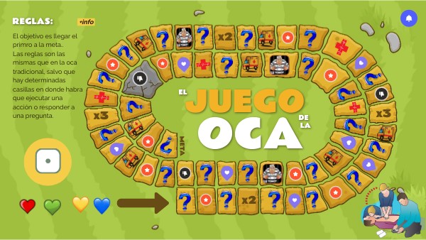 El objetivo es llegar el primro a la meta..Las reglas son las mismas que en la oca tradicional, salvo que hay determinadas casillas en donde habra que ejecutar una acción o responder a una pregunta.