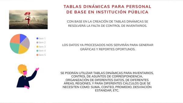 SE PODRÁN UTILIZAR TABLAS DINÁMICAS PARA INVENTARIOS, CONTROL DE ASUNTOS DE CORRESPONDENCIA, ORGANIZACIÓN DE DIFERENTES DATOS, DE DIFERENTES ÁREAS, REGIONES, Y PARA DIFERENTES CÁLCULOS QUE SE NECESITEN COMO: SUMA, CONTEO, PROMEDIO, DESVIACIÓN ESTANDAR, ETC.