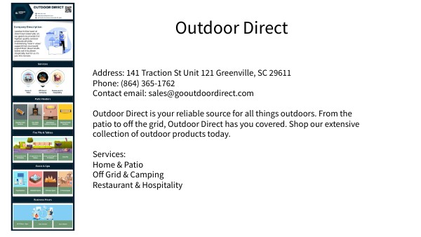 Address: 141 Traction St Unit 121 Greenville, SC 29611 Phone: (864) 365-1762 Contact email: sales@gooutdoordirect.com Outdoor Direct is your reliable source for all things outdoors. From the patio to off the grid, Outdoor Direct has you covered. Shop our extensive collection of outdoor products today. Services: Home & Patio Off Grid & Camping Restaurant & Hospitality