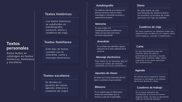Los textos historicos se subdividen en autobiografia, memoria, diario y cuaderno de viaje.