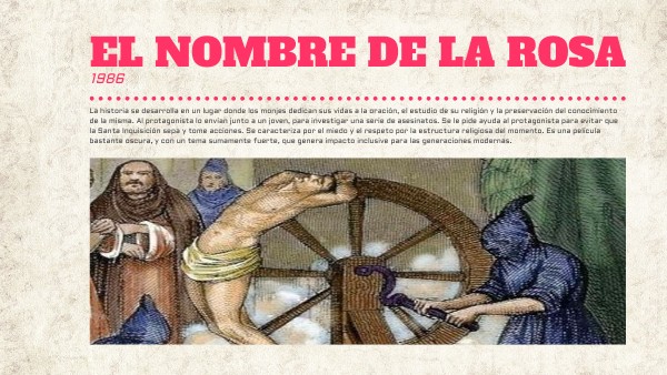 La historia se desarrolla en un lugar donde los monjes dedican sus vidas a la oración, el estudio de su religión y la preservación del conocimiento de la misma. Al protagonista lo envían junto a un joven, para investigar una serie de asesinatos. Se le pide ayuda al protagonista para evitar que la Santa Inquisición sepa y tome acciones. Se caracteriza por el miedo y el respeto por la estructura religiosa del momento. Es una película bastante oscura, y con un tema sumamente fuerte, que genera impacto inclusive para las generaciones modernas.