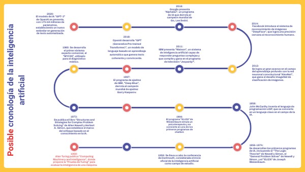 1956-1974:Se desarrollan los primeros programas de IA, incluyendo el "The Logic Theorist" de Newell y Simon, el "General Problem Solver" de Newell y Simon, y el "ELIZA" de Joseph Weizenbaum.