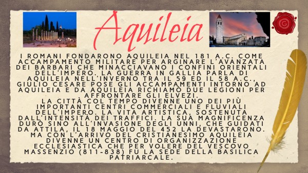 I Romani fondarono Aquileia nel 181 a.C. come accampamento militare per arginare l’avanzata dei barbari che minacciavano i confini orientali dell’impero. La guerra in Gallia parla di Aquileia nell’inverno tra il 59 ed il 58 a.c., Giulio Cesare pose gli accampamenti intorno ad Aquileia e da Aquileia richiamò due legioni per affrontare gli Elvezi. La città col tempo divenne uno dei più importanti centri commerciali e fluviali dell’Impero. La vita artistica, sostenuta dall'intensità dei traffici. La sua magnificenza durò sino all’invasione degli Unni, che guidati da Attila, il 18 maggio del 452 la devastarono. ma con l’arrivo del cristianesimo Aquileia divenne un centro di organizzazione ecclesiastica che per volere del vescovo Massenzio (811-838) fu la sede della Basilica patriarcale.