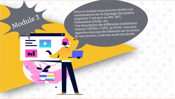 Dans ce module vous pourrez vérifier vos connaissances sur la typologie des publics migrants: C'est quoi un BPI, BPT, Demandeur d'Asile, etc. Une description des différentes institutions comme l'OFPRA, l'OFII, la DIAN, vous sera apportée ainsi que des éléments sur la notion de non recours, et de non accès aux droits.