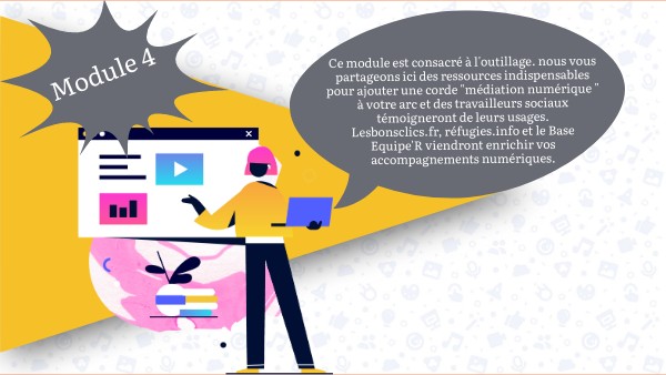 Ce module est consacré à l'outillage. nous vous partageons ici des ressources indispensables pour ajouter une corde "médiation numérique " à votre arc et des travailleurs sociaux témoigneront de leurs usages. Lesbonsclics.fr, réfugies.info et le Base Equipe'R viendront enrichir vos accompagnements numériques.