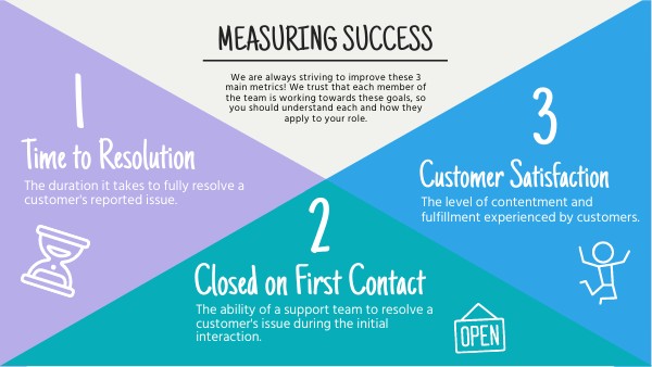 We are always striving to improve these 3 main metrics! We trust that each member of the team is working towards these goals, so you should understand each and how they apply to your role.