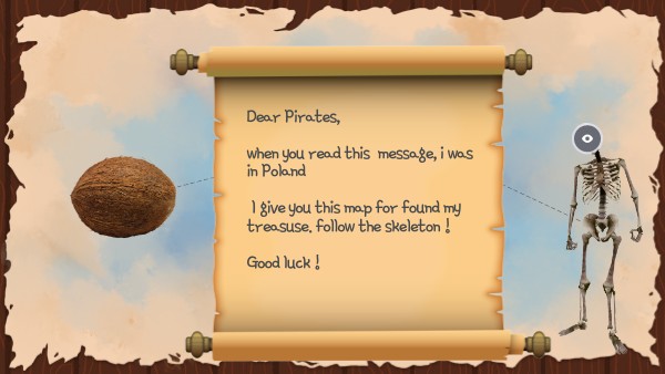 Dear Pirates,When you read this message, i am in Indonesia. I give you this map to find my treasuse. follow the skeleton ! Good luck !