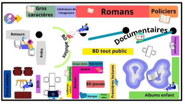 vous pouvez ici faire vos prêts et vos retours. Vous pouvez également demander à faire des recherches dans le catalogue de la médiathèque ou dans celui de la bibliothèque départementale.
