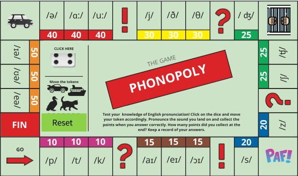 Test your knowledge of English pronunciation! Click on the dice and move your token accordingly. Pronounce the sound you land on and collect the points when you answer correctly. How many points did you collect at the end? Keep a record of your answers.