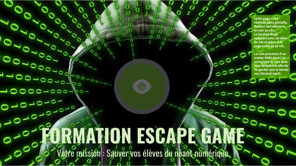 Cette page a été réalisée dans génially. Bouton cible apparait avec un délai de 10s et fait apparaitre à son tour le texte instruction. Les chiffre cachés mènent vers les pages des enigmes à découvrir. Le bouton Home mène vers la page solution. Sur la page solution, il mène sur cette page.