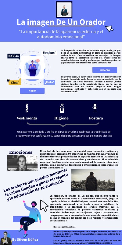 En resumen, la imagen de un orador, que incluye tanto la apariencia externa como el autodominio emocional, juega un papel crucial en su efectividad para comunicarse con éxito. Una apariencia profesional y cu idada ayuda a establecer la credibilidad y la confianza del orador, mientras que el autodominio emocional le permite transmitir confianza y autoridad. Ambos aspectos trabajan en conjunto para crear una imagen poderosa y persuasiva, lo que aumenta las posibilidades de que el mensaje del orador sea bien recibido y comprendido por la audiencia.